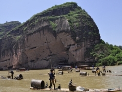 几位表演者在江西鹰潭龙虎山仙水岩悬棺遗址举行的模拟悬棺安放表演。离水面高达 ...